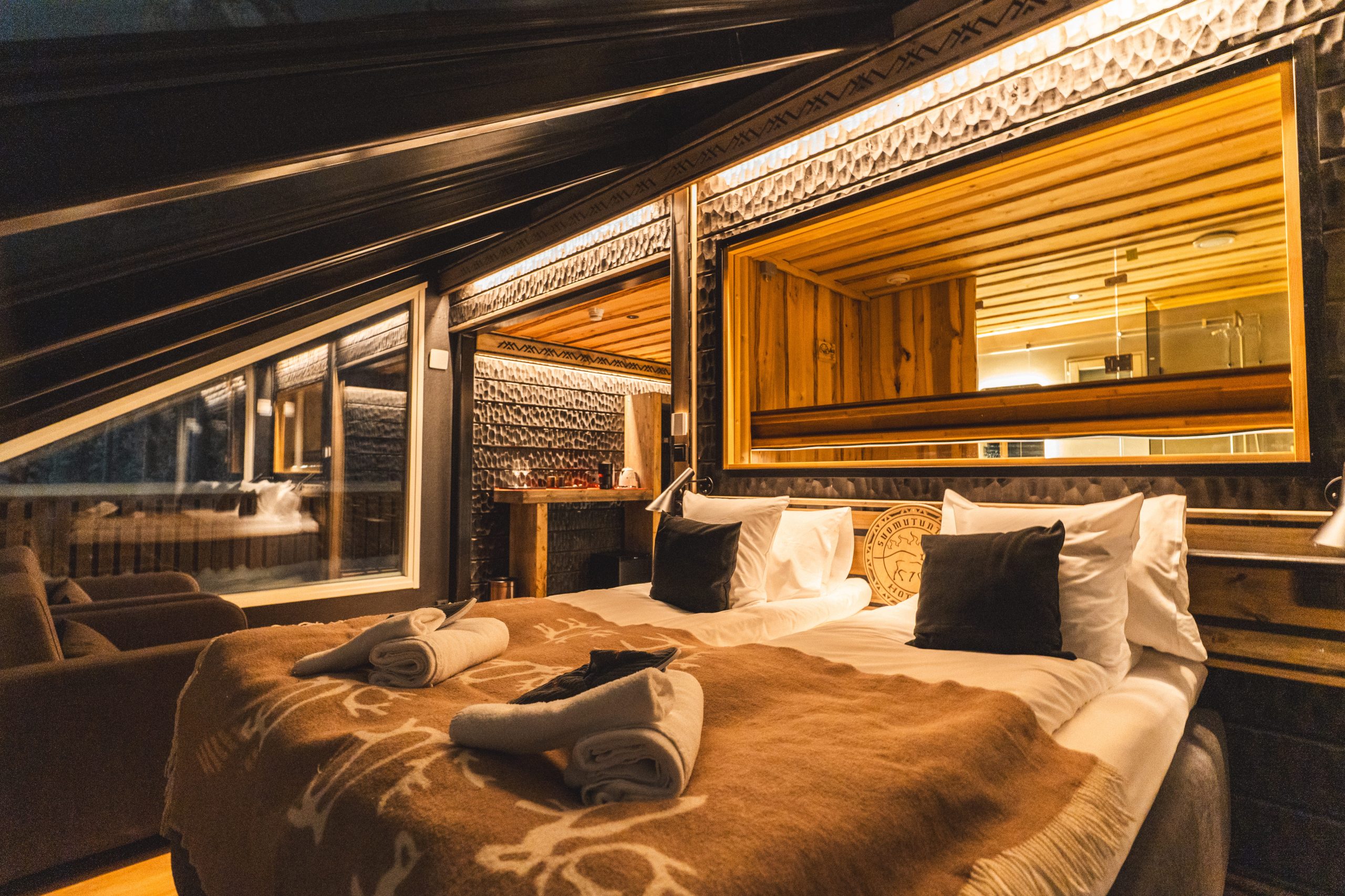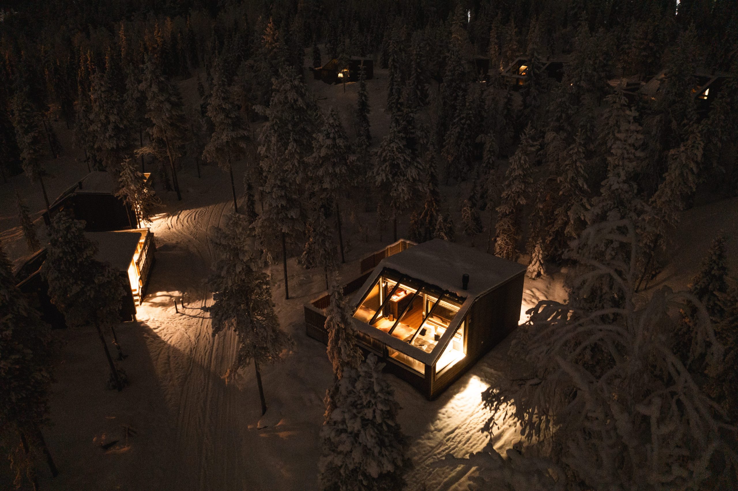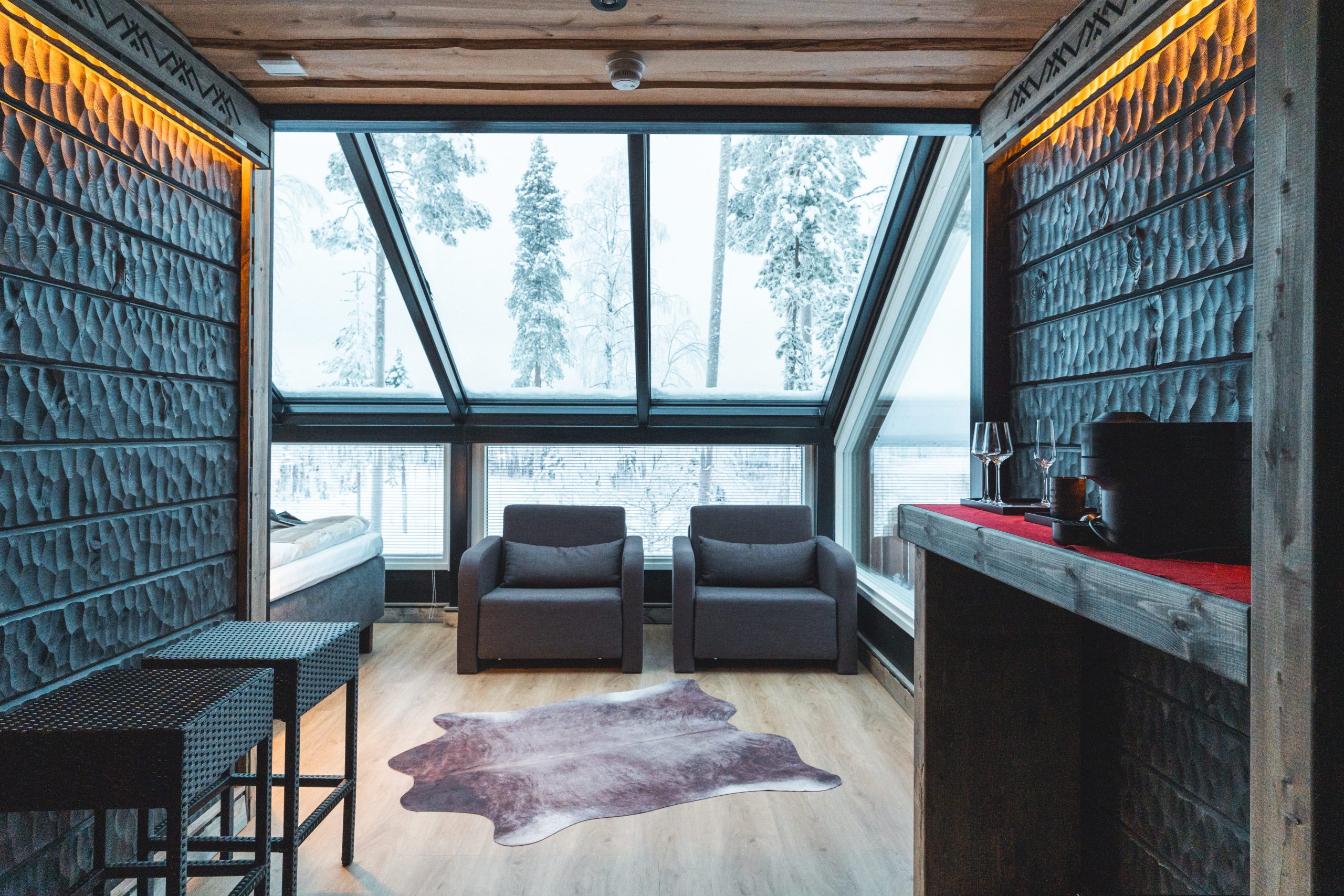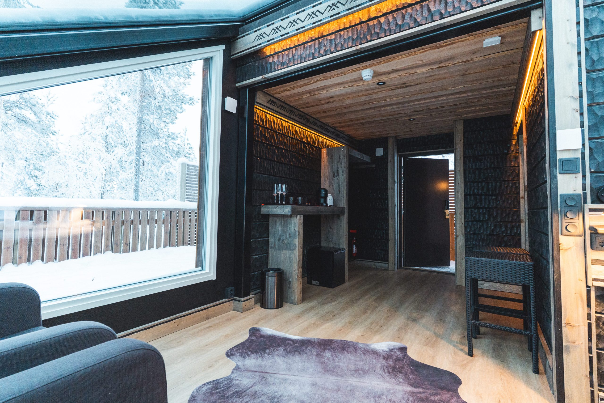 Moderneissa, 30 m² kokoisissa Aurora Villoissa pääset katselemaan revontulia tai pohjoista tähtitaivasta suoraan makuuhuoneestasi. Makuutilan katseenvangitsija on suuri kattoikkuna, josta avautuu näkymä taivaalle. Hyvällä onnella pääset siis ihailemaan revontulia suoraan vuoteesta!